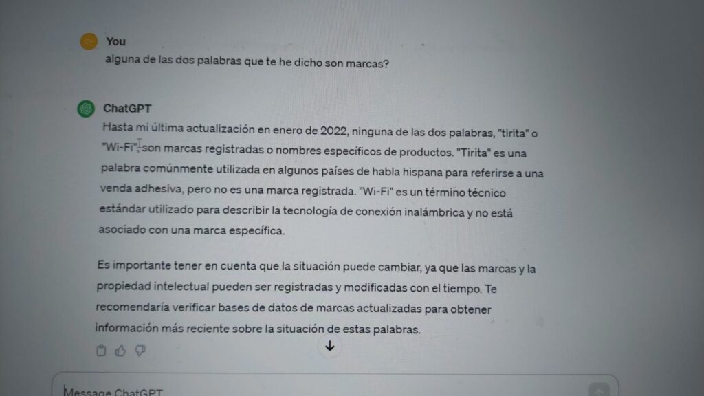 Una vez visto esto, es bastante llamativo el hecho de que no solo no dice que son marcas sino que lo niega. Creo, al menos desde mi punto de vista, que podría llegar a comenzarse a tenerse en cuenta el uso de la IA como medio para recabar información como “obra de consulta similar” y , por tanto, como posible fuente o causa de “inactividad” por parte del titular de la marca. Pudiendo llegar a ocasionar la vulgarización de su marca.